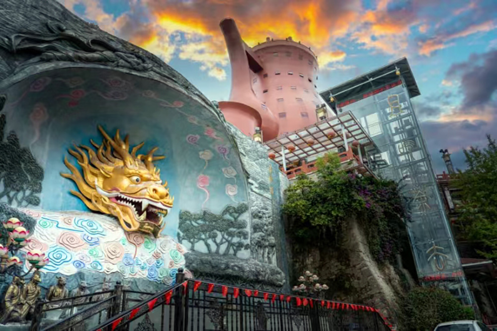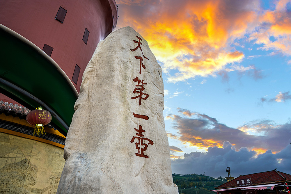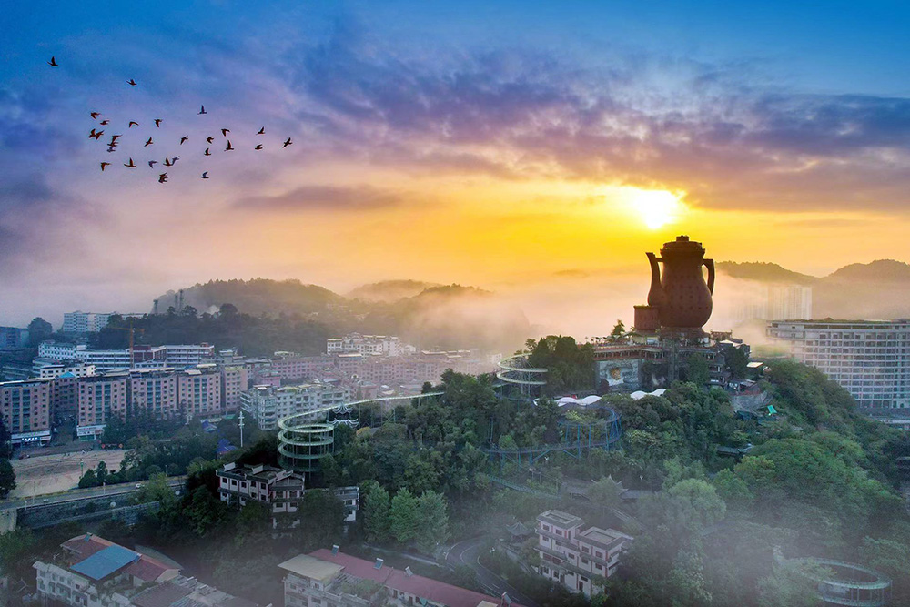 获得“大世界基尼斯之最”和“中国十大外形奇特建筑”称号的“天下第一壶”,耸立在湄江河畔风景秀丽、绿树丛荫的火焰山上,是世界最大的茶壶实物造型,是湄潭的标志性旅游、建筑、商业与城市名片。